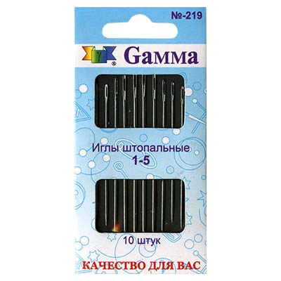 Иглы для штопки Gamma N-219 , средней толщины. Короткие иглы для штопки шерстяной одежды и носков, и длинные иглы для более тонких работ по штопке. Иглы имеют типичную сужающуюся форму швейной иглы, но они по своим размерам немного больше и, следовательно, имеют пропорционально скорректированное ушко большего размера. Это также позволяет вдевание стабильных ниток и пряжи.